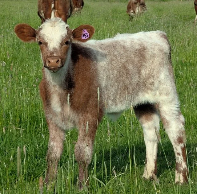 2. "Palouse Raspberry" is a beautiful horned heritage heifer born 6/7/25. Her dam is a well-proportioned cow with a nice udder. She would make an excellent family milk cow or great addition to any herd. Grandsires include Kenmar President 26A and Albo. Check out her full lineage below: