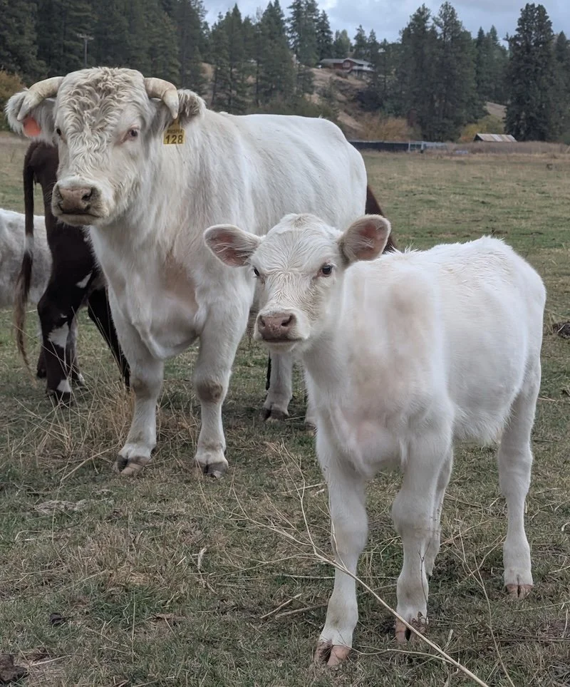 2. Beautiful white polled bull calf with amazing genetics. Pictured here with his sire in the background he has some historic greats in his lineage such as Albo and Canadian Image. Born 7/10/25. Birth weight 81#. $3200. See his dam and sire pedigrees here: