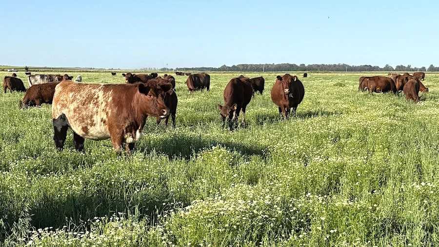 He has approximately 380 cows on 400 hectares of pasture, and also grows corn and winter greens. Unfortunately because of the marshy conditions from this year’s heavy spring rains & flooding, it was difficult to see all of his herd up close even though we were in a 4-wheel drive vehicle. He indicated that calving had been tough this spring, which was understandable. It speaks well to his breeding program that his Shorthorns looked so good despite the difficulties they had faced due to the weather.